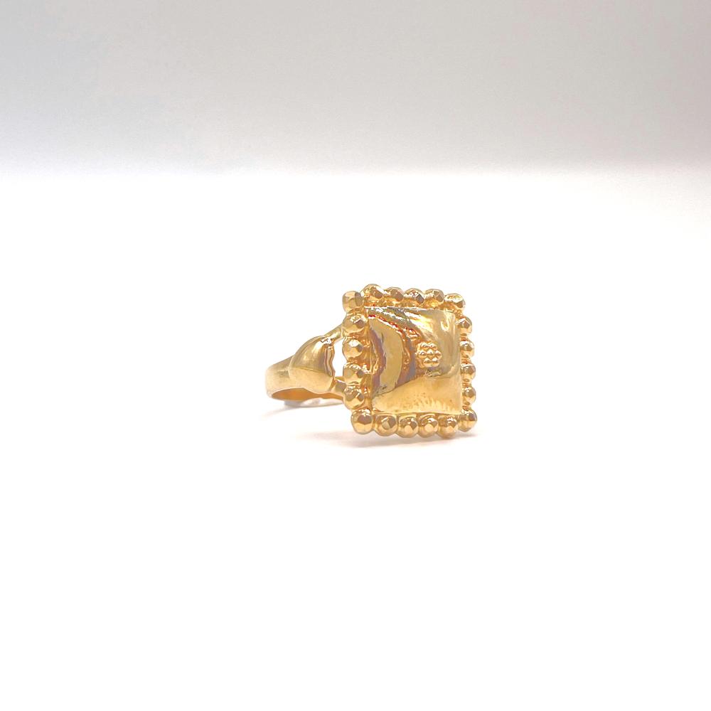 • تصميم فريد: يتمتع الخاتم بشكل مربع مع حواف مزخرفة، مما يضفي عليه لمسة من الأناقة والتميز.