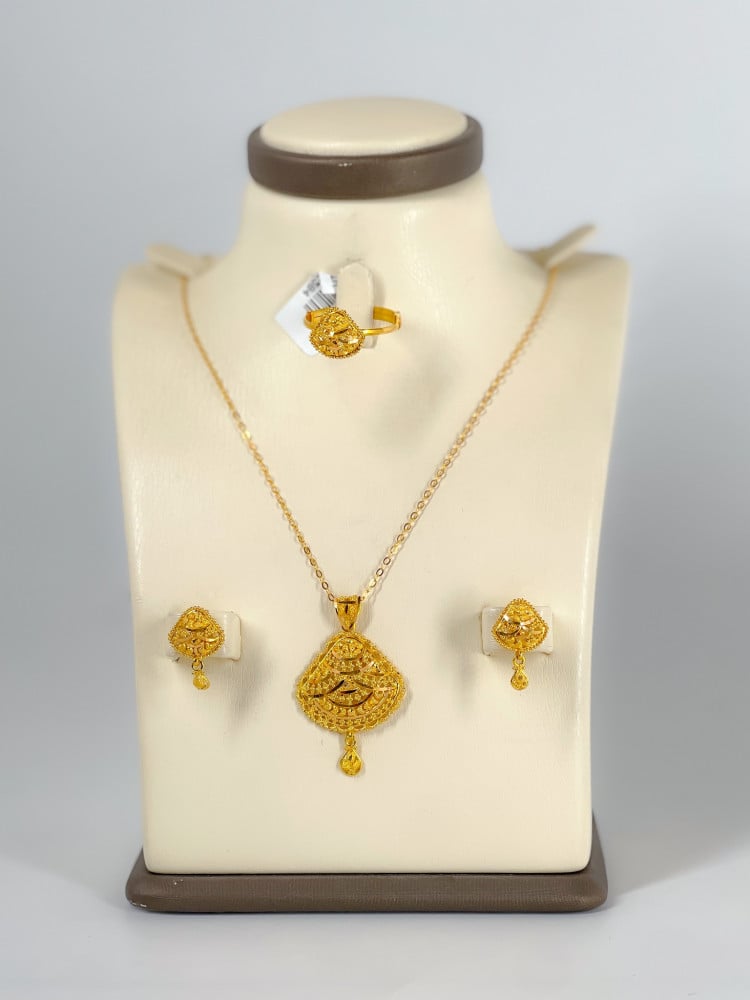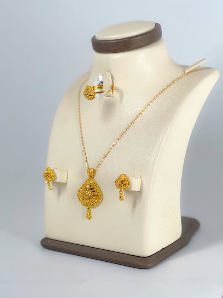 لا تفوت فرصة اقتناء طقم ذهب عيار 21 بتصميم مميز وزن 11.18 جرام. اجعل كل لحظة مميزة مع هذا الطقم الفاخر. أضف لمسة من الفخامة إلى مجموعة مجوهراتك اليوم!