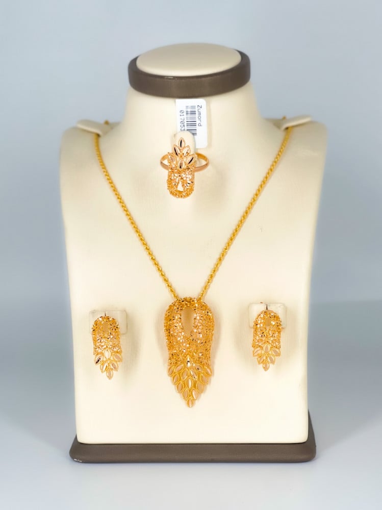- تصميم أنيق: يتكون الطقم من قلادة، وأقراط، وخاتم، جميعها تحمل تفاصيل دقيقة تضيف لمسة من الفخامة.